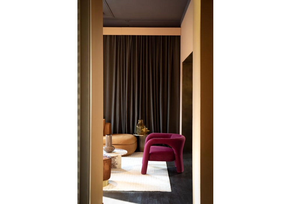 Aimée conçu par Christophe Delcourt pour Baxter est un fauteuil avec structure et assise en métal et mousse polyuréthane. Revêtement en cuir souple uniquement.