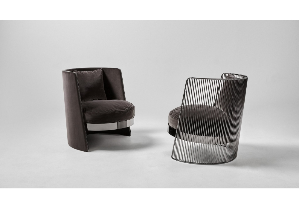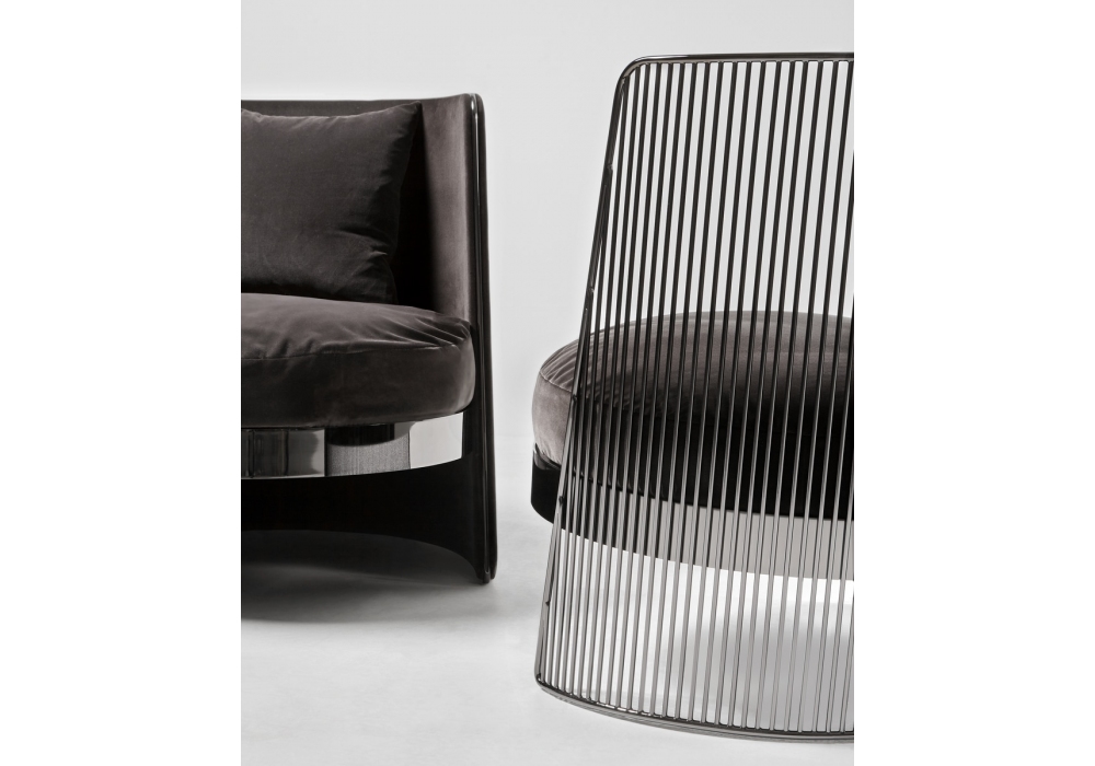 Joelle conçu par Carlo Colombo pour Antonio Lupi est un fauteuil avec une structure interne en contreplaqué de peuplier avec des sangles élastiques. La base et la structure extérieure sont en métal avec un revêtement chromé noir. Le rembourrage est en mousse de polyuréthane à mémoire de forme, avec un revêtement en tissu ou en cuir partiellement amovible.