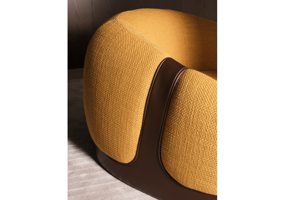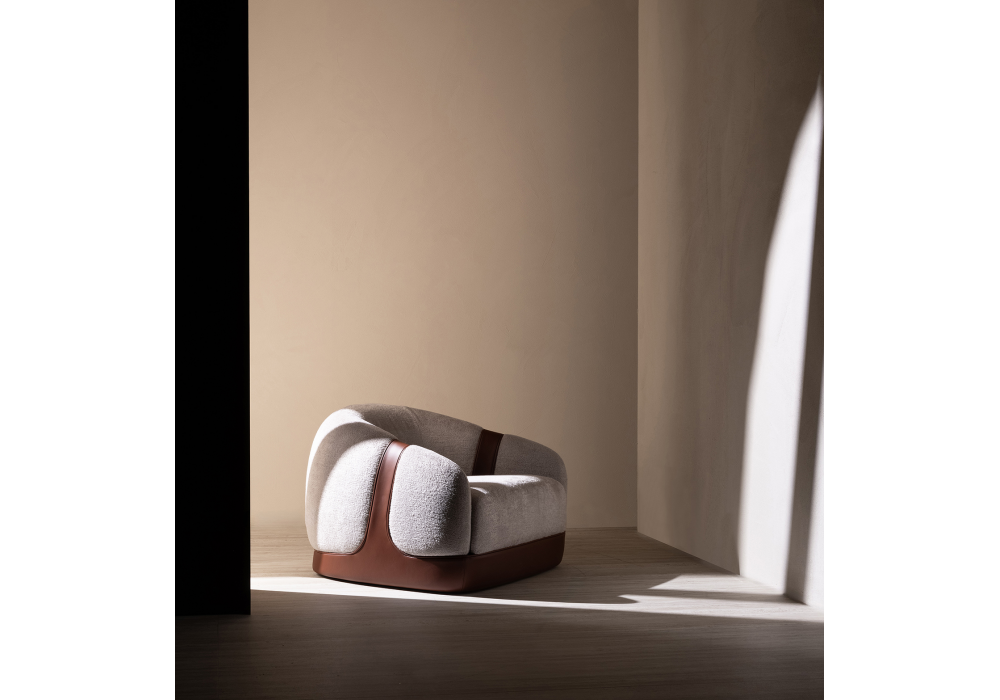 Corsetto conçu par Cristián Mohaded pour Molteni&C est un fauteuil au design contemporain enveloppant, caractérisé par des volumes doux et des proportions équilibrées. Sa structure rembourrée assure confort et ergonomie, tandis qu'une ceinture en cuir souligne les accoudoirs et l'assise, évoquant la forme d'un corset. Le piètement massif garantit la stabilité, contrebalançant la douceur de la coque. Revêtu de cuir ou de tissu, même dans des combinaisons contrastées, il offre une grande polyvalence esthétique et s'adapte à tous les intérieurs.