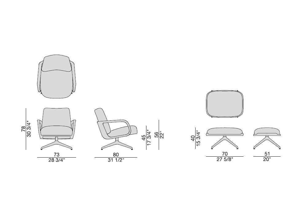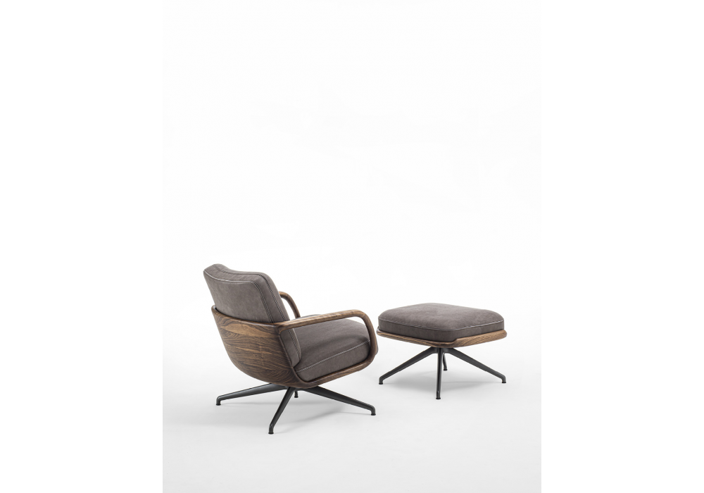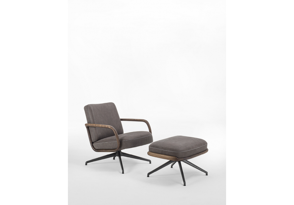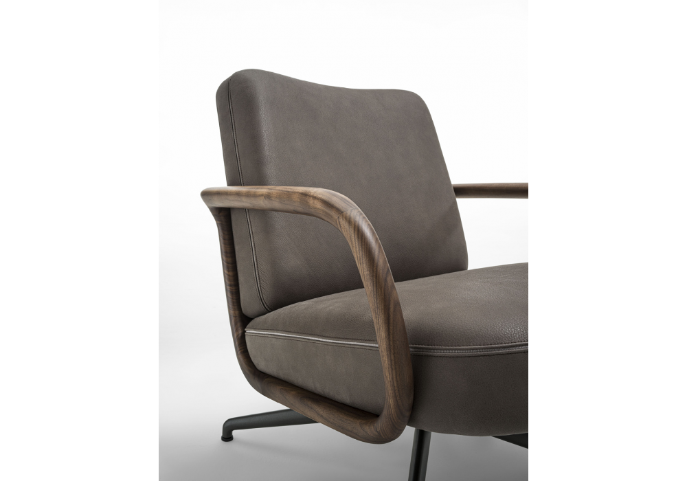 Cuna Lounge Low conçu par Emmanuel Gallina pour Porada est un fauteuil à dossier bas doté d'un piètement pivotant en métal et d'un mécanisme de retour. La structure interne du dossier et de l'assise est en contreplaqué, tandis que le revêtement extérieur est réalisé en tissus de la collection et présente un passepoil négatif cousu entre les deux coutures. La coque extérieure est en noyer canaletta massif avec accoudoirs intégrés. Un repose-pieds Cuna Lounge peut être ajouté.