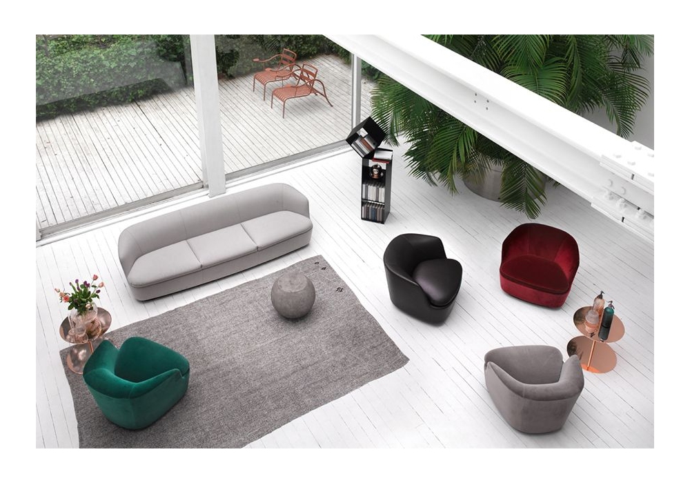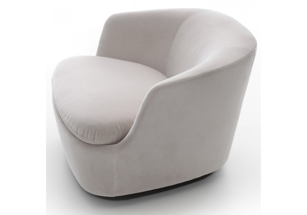Orla conçu par Jasper Morrison Cappellini est un fauteuil en mousse de polyuréthane à densité différenciée et rembourrage en fibre, base en panneau de conglomérat de bois de densité moyenne et revêtement fixe en tissu ou cuir. Disponible avec base fixe ou pivotante.
