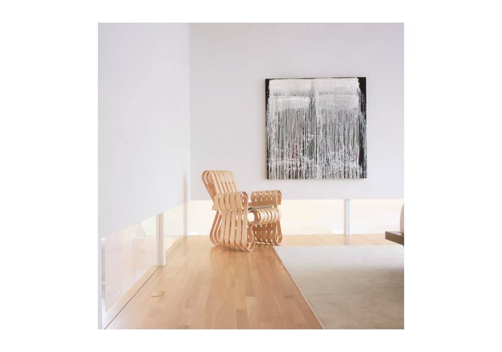Power Play™ conçu par Frank Gehry pour Knoll est un fauteuil avec repose-pieds en bois d'érable naturel. Pieds en plastique transparent avec finition mate. Le dossier est composé de bandes préformées pour renforcer le soutien lombaire.