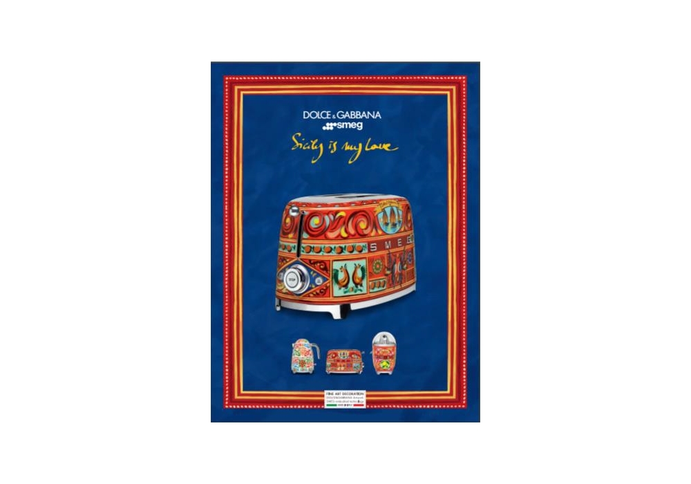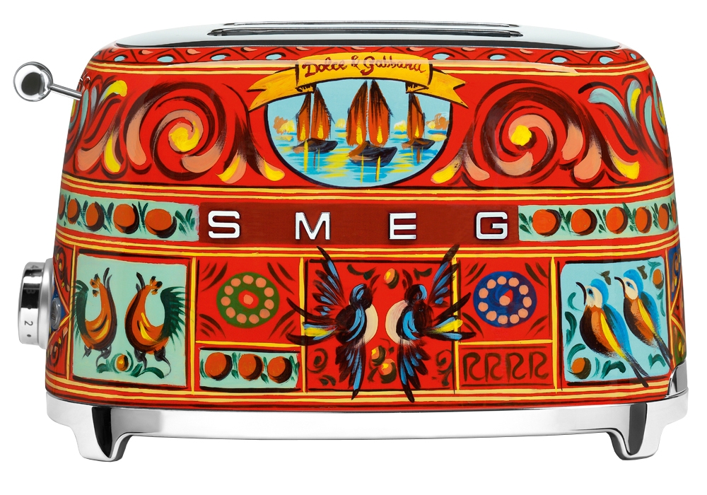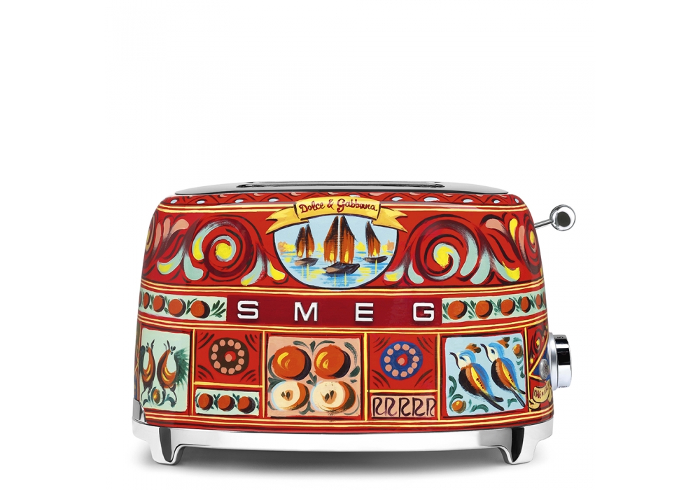 Sicily is my love Grille-pain conçu par Dolce&Gabbana pour Smeg, est réalisé avec un corps en acier, bouton en acier inoxydable et des pièces chromées. Le grille-pain est décoré avec les "Bummuli et Quattare" typiques, les vases siciliens en terre cuite avec le même style de la "Carretto".