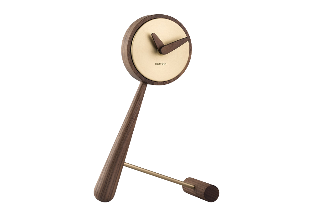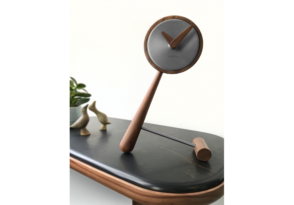 Mini Puntero conçue et produite par Nomon est une horloge de table avec corps et aiguilles en bois de noyer, boîtier central en laiton poli ou finition graphite.