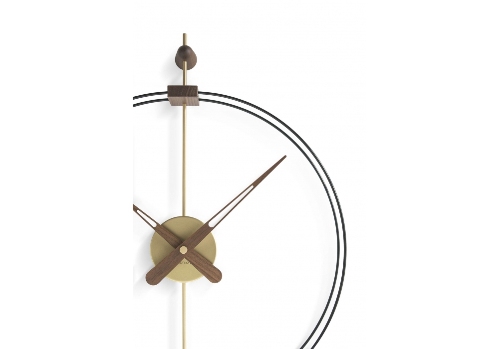 Micro Barcelona conçue et produite par Nomon est une horloge avec structure en fibre de verre noire avec aiguilles en noyer laqué noir et boîtier en laiton poli ou peint en graphite.