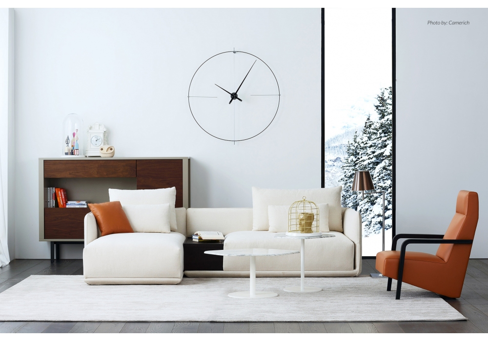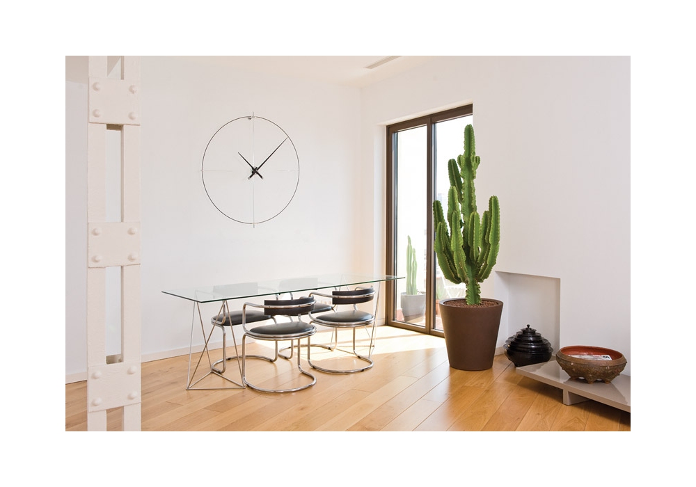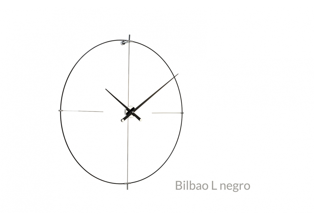 Bilbao conçue et produite par Nomon est une horloge avec structure en fibre de verre noire ou blanche, aiguilles en noyer naturel ou laqué noir ou blanc.