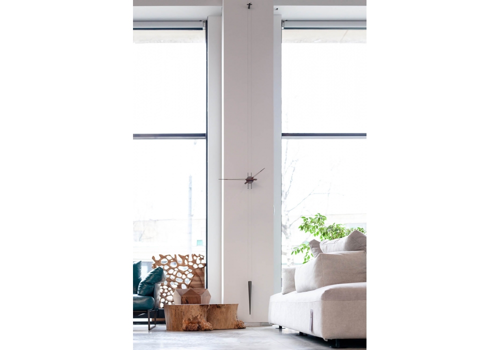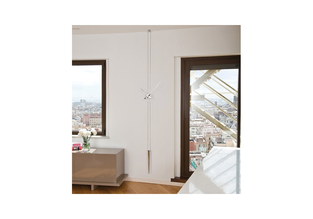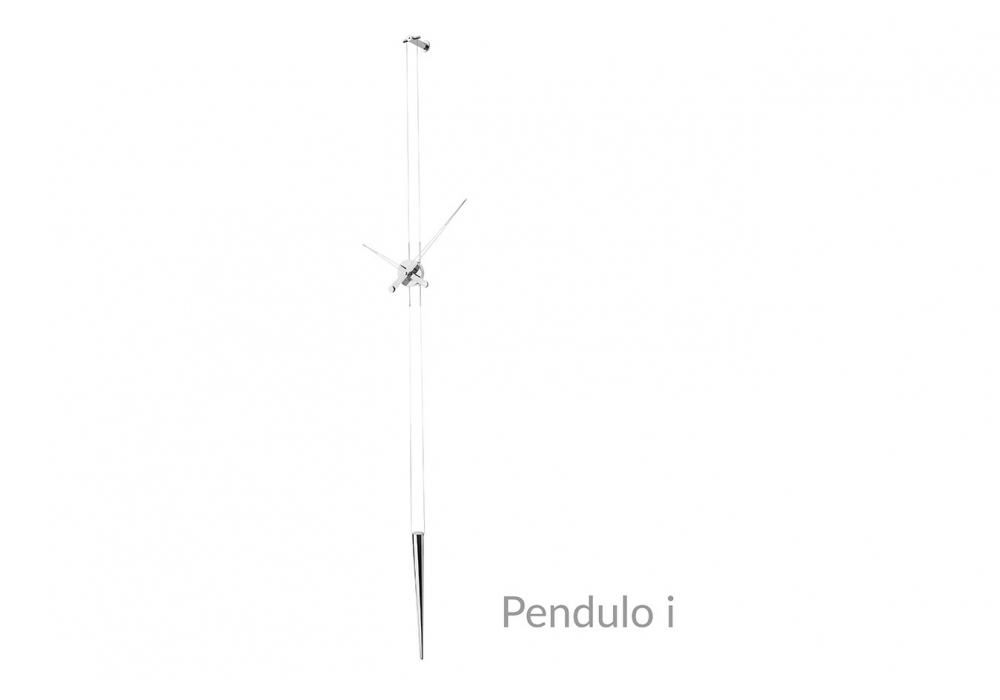 Péndulo conçu et produit par Nomon est une horloge avec aiguilles et pendule en acier ou en bois de noyer, boîtier central en finition chromée, laiton poli ou graphite.
