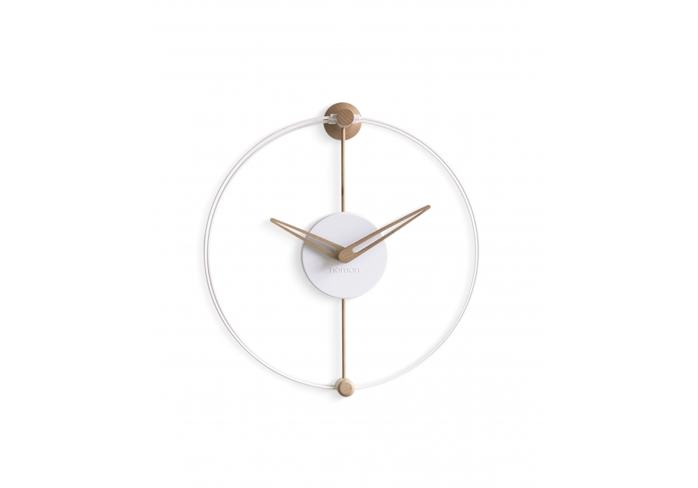 Nano conçue et produite par Nomon est une horloge murale avec des aiguilles et des détails en bois de noyer ou de chêne, la boîte centrale est en polystyrène noir.