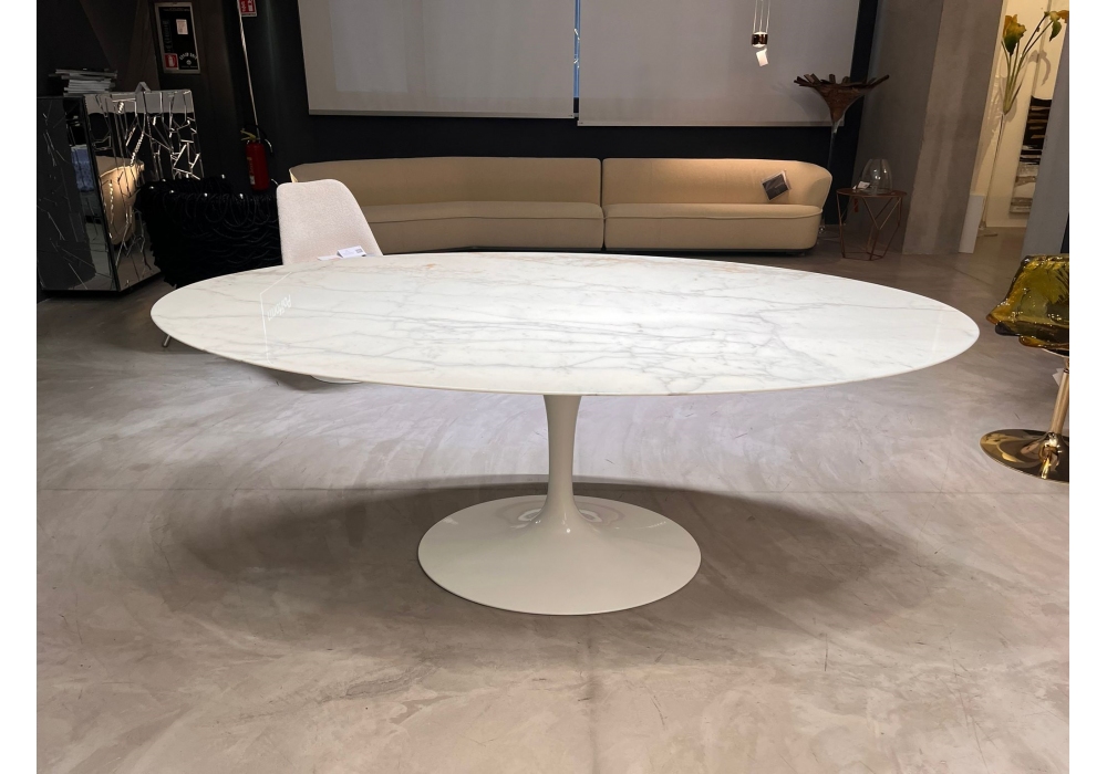 Saarinen conçue par Eero Saarinen pour Knoll est une table ovale avec plateau en marbre et base en aluminium moulé, en blanc, avec finition Rilsan. Une plaque avec le logo KnollStudio et la signature du designer est fixée sous le plateau.