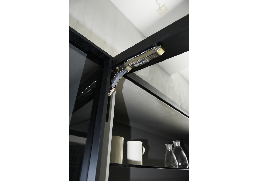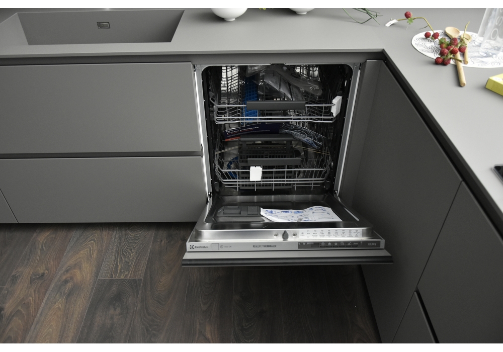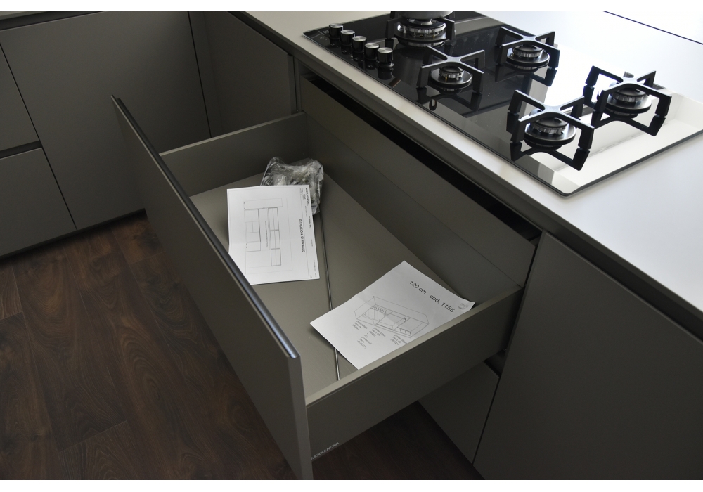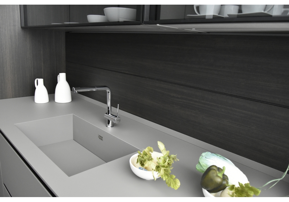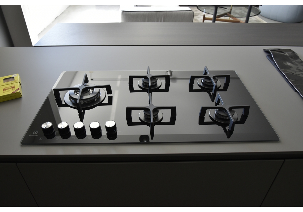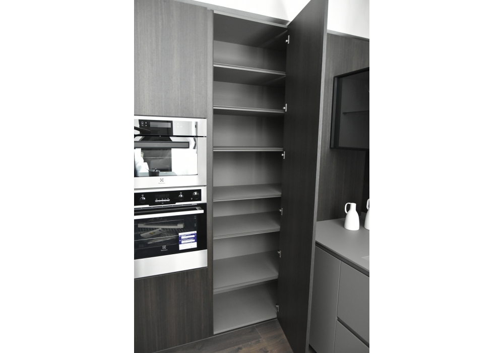 Light-MH6 conçu par Modulnova est une composition faite avec des composants des deux cuisines. Portes en fenix atmosphere et verre fumé, dessus en fenix atmosphere et dessus snack en eucalyptus. Complet avec réfrigérateur, four, micro-ondes et lave-vaisselle Electrolux.