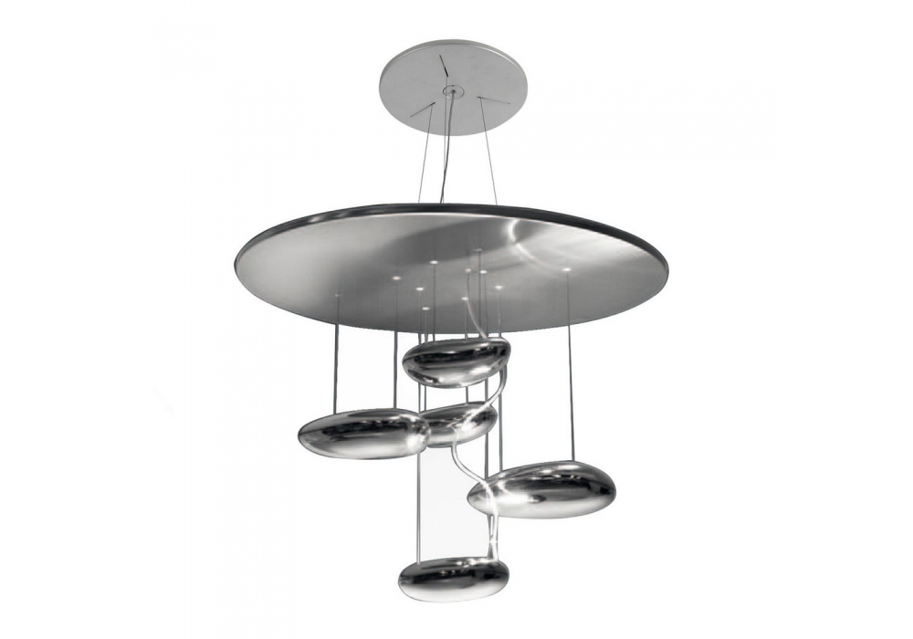 Mercury Mini conçue par Ross Lovegrove pour Artemide est une lampe de suspension consistant en une série de gros galets flottant sous un disque en aluminium simple. À leur tour, les cailloux sont reflètent mutuellement rebondir la lumière entre leurs surfaces biomorphique lisses. Pendant la journée, l'objet est une sculpture qui reflète la dynamique de la lumière naturelle et la circulation des personnes autour de lui. Corps d'aluminium coulé brillant; Corps réfléchissants en matériau thermoplastique moulé par injection avec finition métallique; réflecteur en aluminium embouti.