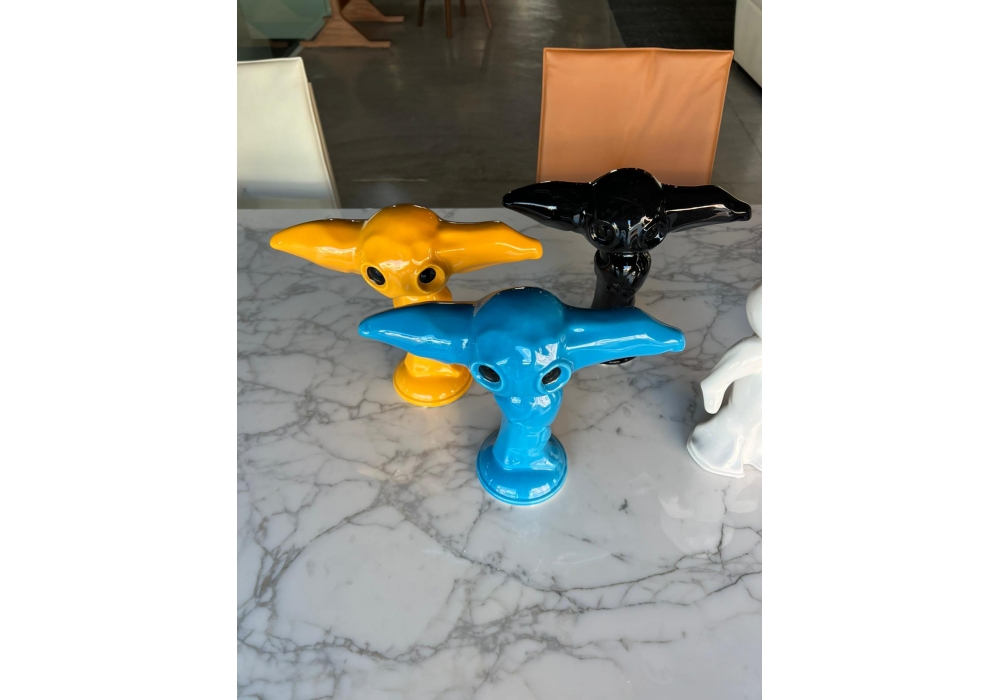 Momonsters Blue Julian conçue par Giovanni Motta pour Bosa est une sculpture en céramique enrichie de glaçures colorées qui représente un sujet irréel qui fait référence à un univers d'enfance, nous faisant faire un long voyage dans le temps. Le créateur s'inspire des dessins animés japonais et des dessins de ses enfants. Blue Julian est disponible en couleur turquoise brillante.