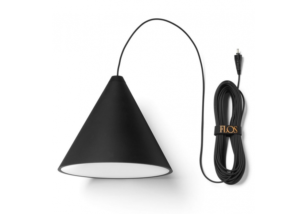 String Light Cone conçue par Michael Anastassiades pour Flos est une lampe à suspension en aluminium et polycarbonate. Finition noir. Interrupteur au sol inclus.