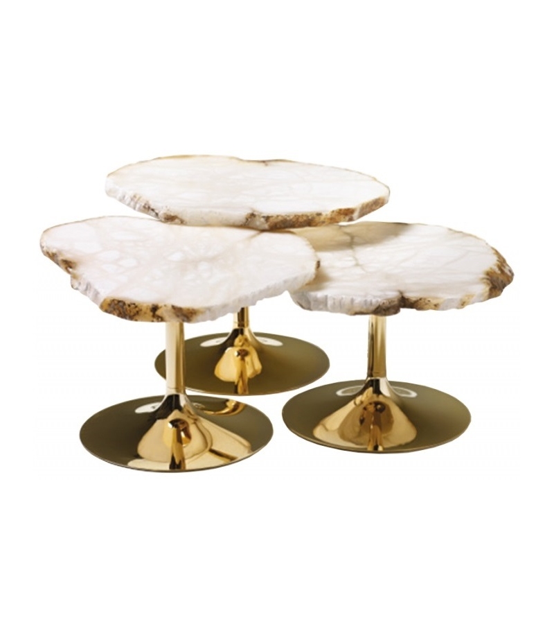 Cicladi conçue par Jacopo Foggini pour Edra est une table basse réalisée avec une base en acier brossé couleur or et un plateau blanc de couleur naturelle.
