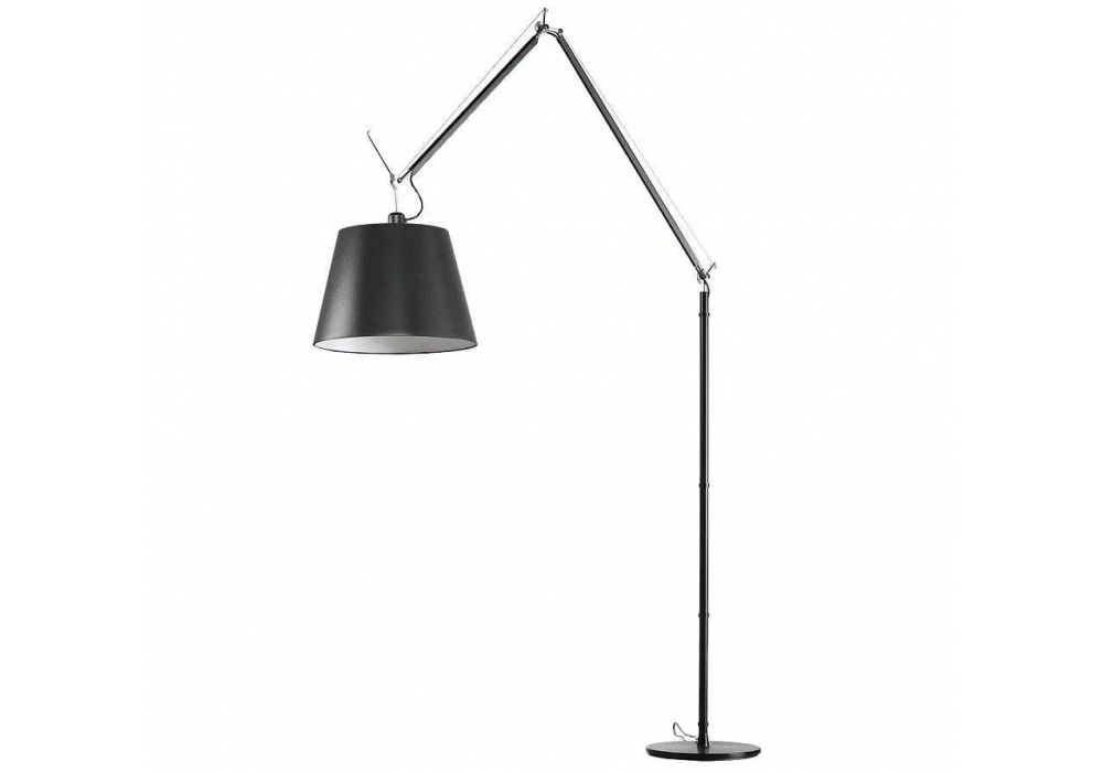 Tolomeo Mega Tissue conçu par Michele De Lucchi & Giancarlo Fassina pour Artemide est un lampadaire avec base circulaire en aluminium et bras mobiles en aluminium finition noire. L'abat-jour est de forme circulaire et réalisé en tissu noir flexible et adopte une source de lumière LED avec un système dimmable.