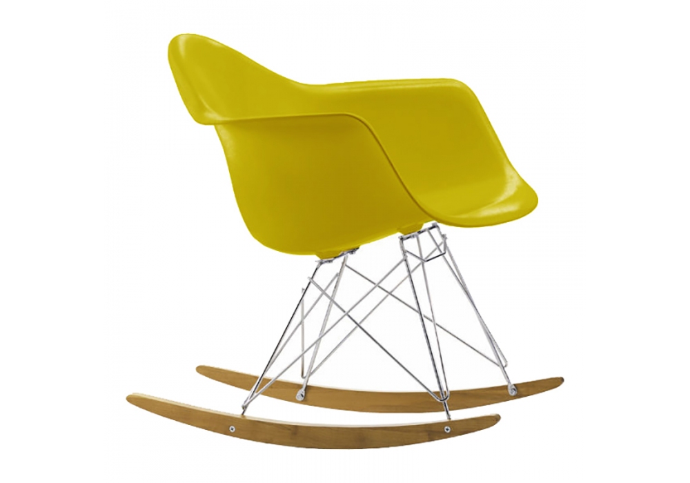 Eames Plastic Armchair RAR conçu par Charles & Ray Eames pour Vitra est un fauteuil à bascule réalisé avec coque en polypropylène moutarde, base en fil d'acier chromé et patins en érable jaune.
