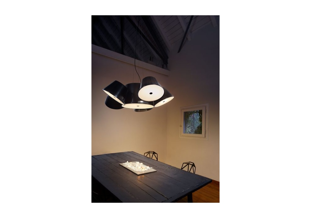 Tam Tam conçue par Fabien Dumas pour Marset est une suspension composée d'un grand abat-jour central en aluminium et de trois abat-jour satellites orientables en aluminium. Diffuseurs en méthacrylate opalin.