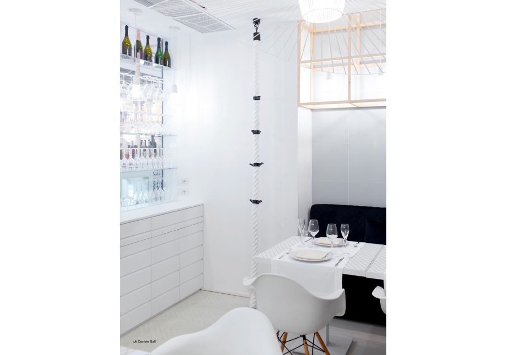 La Cima3 conçu par Lapo Ciatti pour Opinion Ciatti est un portemanteau à plafond composé de crochets et d'anneaux métalliques et de corde nautique tressée.