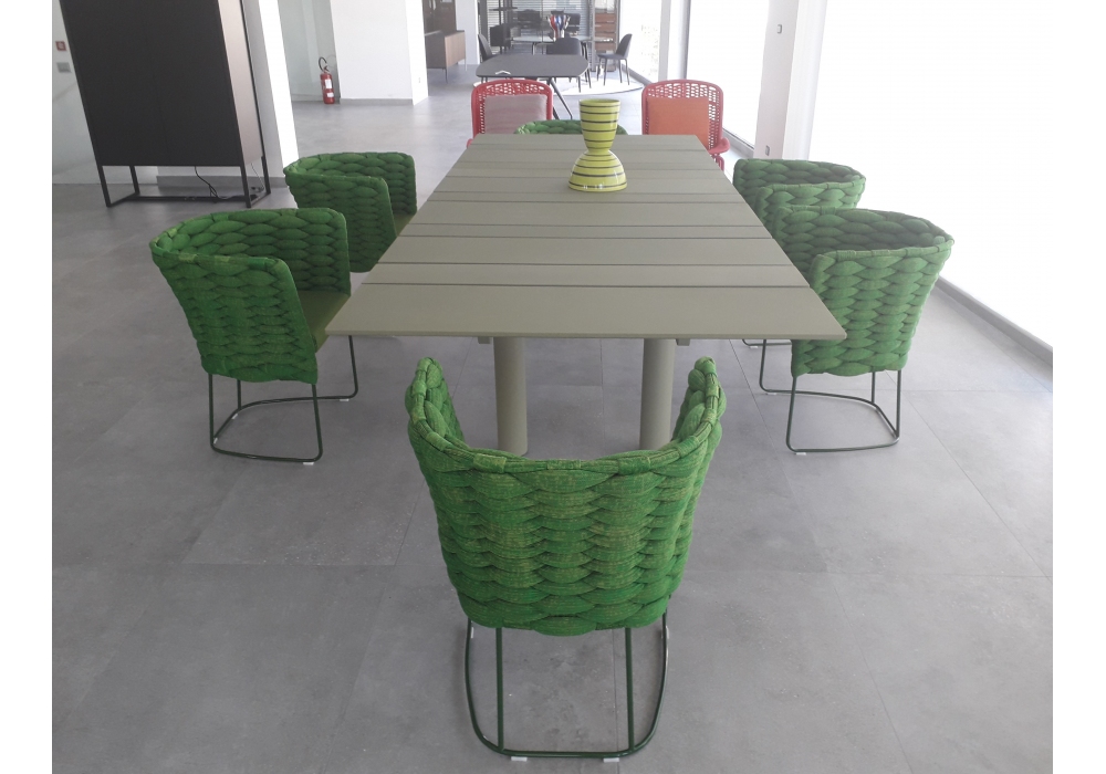 Ami conçue par Francesco Rota pour Paola Lenti est une chaise d'extérieur avec revêtement fixe tissé à la main sur une structure en acier peint assortie au revêtement du siège.