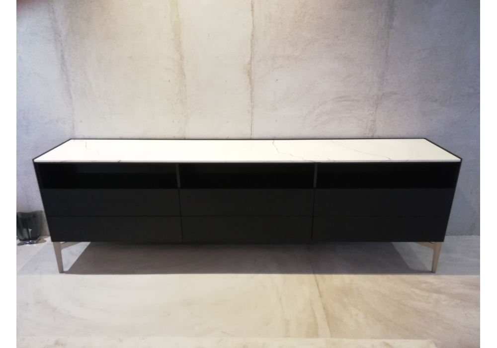 Code conçu par R&D Poliform est un buffet à six tiroirs et trois compartiments ouverts réalisé avec plateau en marbre Zecevo lisse, côtés et dossier en bois d'orme noir, base en métal et fond des tiroirs rembourrés en tecnopelle.
