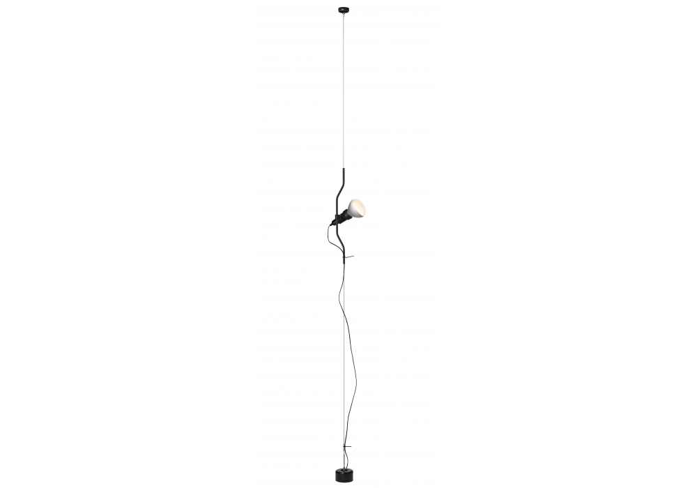 Parentesi D conçue par Achille Castiglioni & Pio Manzù pour Flos est une lampe à lumière directe. Le mouvement vertical du corps lumineux est obtenu par le coulissement d'un tube en acier profilé, peint liquide ou nickelé, sur un câble en acier tendu entre le plafond et le sol. La tête du luminaire est en élastomère noir moulé par injection, et abrite l'interrupteur. Variateur d'intensité intégré. Ampoule non incluse.