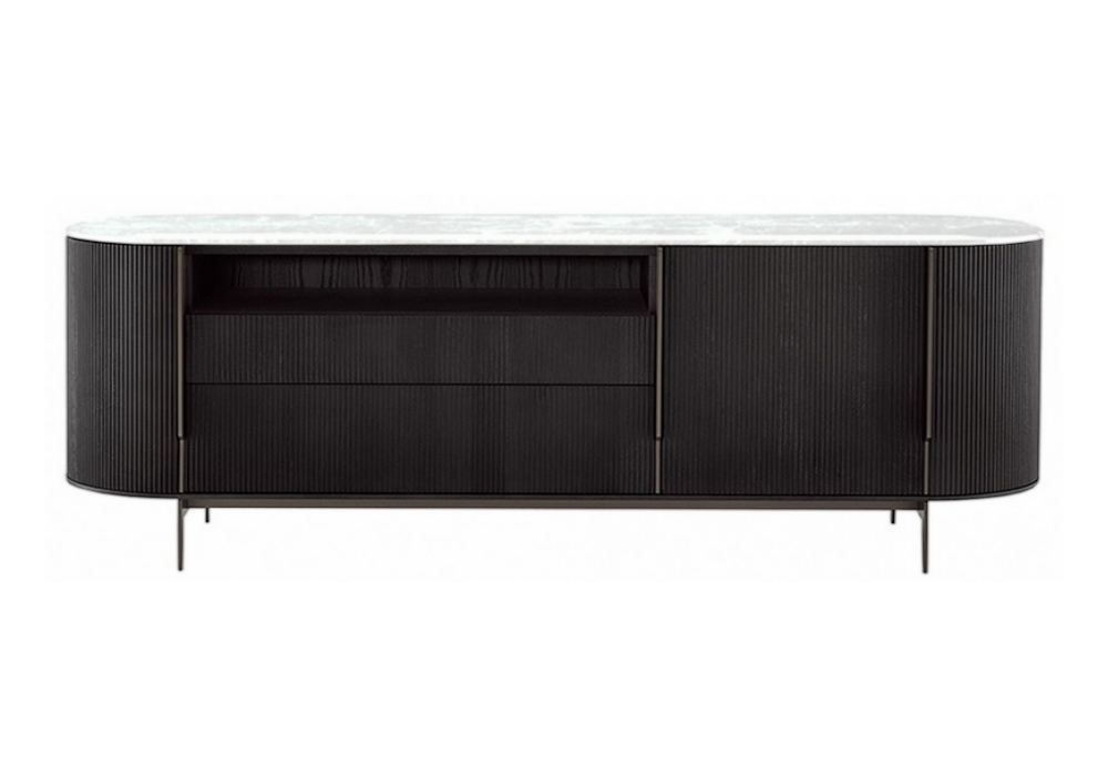 Kumi conçu par Carlo Colombo pour Gallotti&Radice est un buffet avec portes, tiroirs et espace ouvert. Structure en frêne laqué noir pore ouvert, recouverte frontalement et latéralement d’une bande moletée à la main. Compartiments avec porte équipée d’une étagère en bois. Plateau en marbre Calacatta Vagli Oro. Poignées et pièces métalliques en métal laqué couleur “fango”.