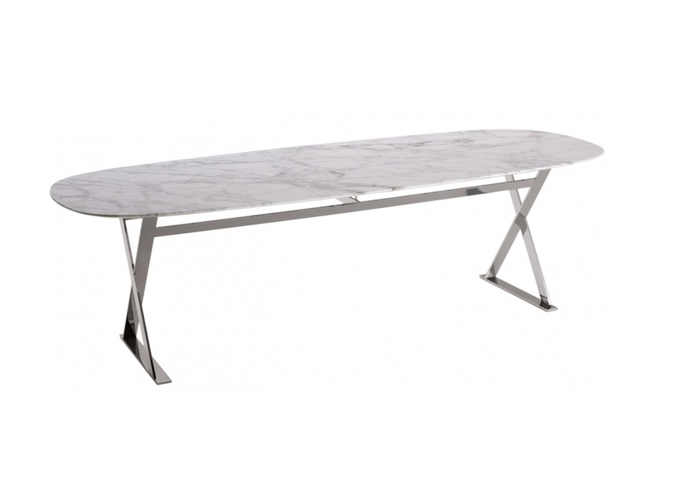 Pathos conçue par Antonio Citterio pour Maxalto est une table réalisée avec plateau en marbre Calacatta blanc brillant et structure chromée brillante.