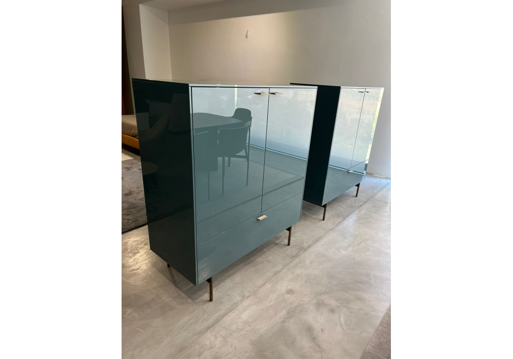 LT40 conçu par David Lopez Quincoces pour Lema est un buffet réalisé avec une base en métal et une structure laquée brillante finition Persia. Poignée et bacs en métal peint bronze patiné à deux portes et un tiroir.