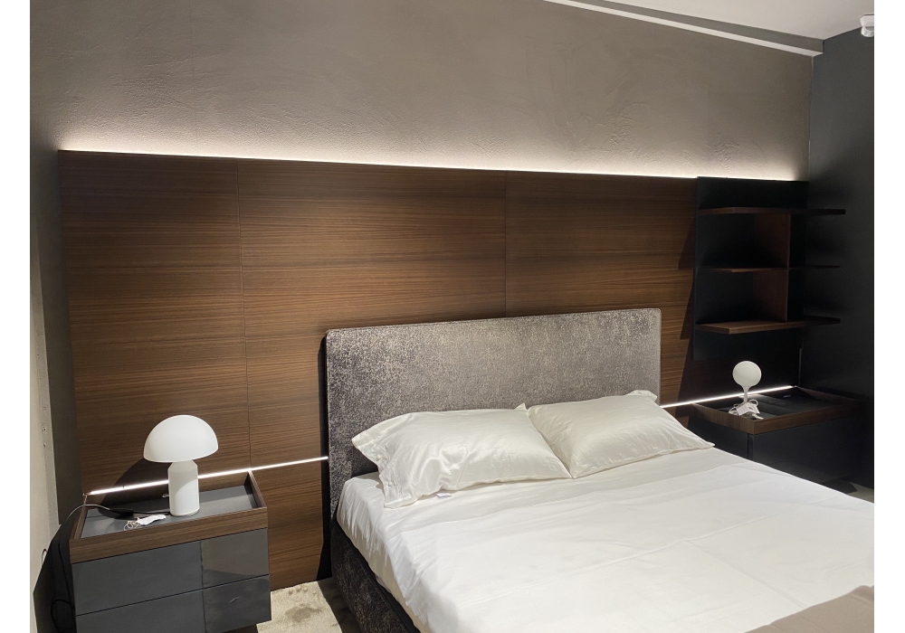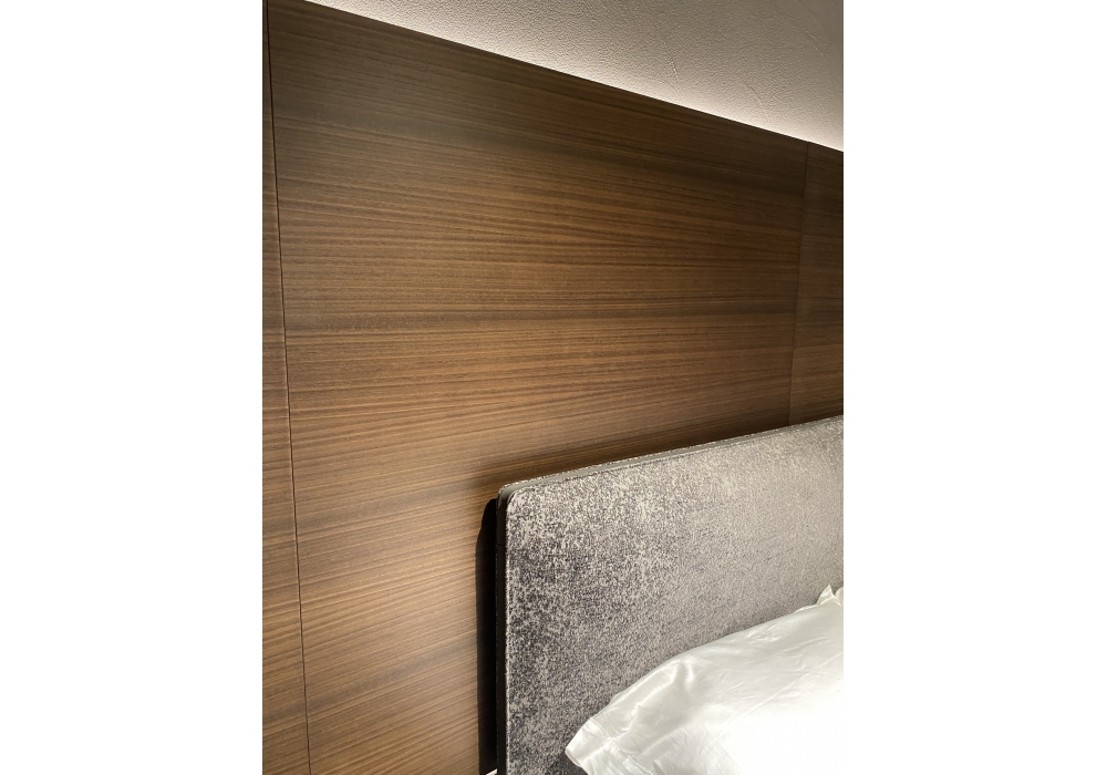 Grid conçu par Vincent Van Duysen pour Molteni&C est un système modulaire pour la zone nuit équipé de panneaux en bois d'eucalyptus fixés au mur avec rétroéclairage LED. Meubles de rangement suspendus avec tiroirs réalisés avec un intérieur en ecoskin gris et une structure anthracite brillante. Unité murale avec étagères en essence d'eucalyptus.