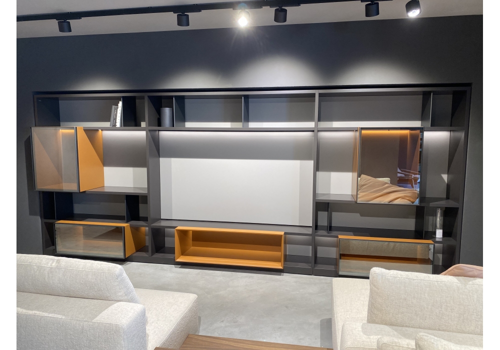 505 UP conçu par Nicola Gallizia pour Molteni&C est un système modulaire flexible avec les caractéristiques d'un meuble fini avec un dos laqué finition London Sky mat. Étagères, côtés et socle en finition laquée mate moka et éléments saillants en finition épice avec portes en verre transparent. Complet avec barres d'éclairage pour compartiments internes 3000 ° K.