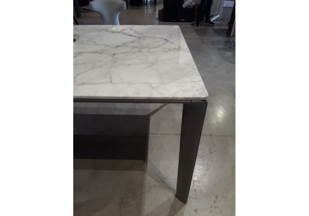 Homey conçue par GamFratesi pour Poltrona Frau est une table avec structure en aluminium peint et plateau en marbre.