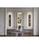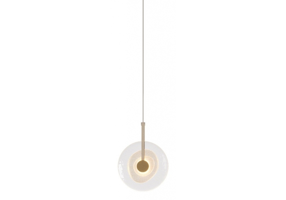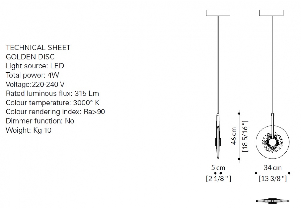 Golden Disc conçue par Paolo Castelli est une suspension créée avec un élément d'éclairage moulé à la main en verre de Murano, recouvert de trois couches de feuille d'or. Le verre, qui réfléchit la lumière et la diffuse dans la pièce, est serti dans un disque en métal finition or mat et soutenu par un support en métal recouvert de cuir couleur sable. Chaque élément est livré avec une rosace en métal finition or mat et un câble de support électrique d'une longueur maximale de 2 mètres.