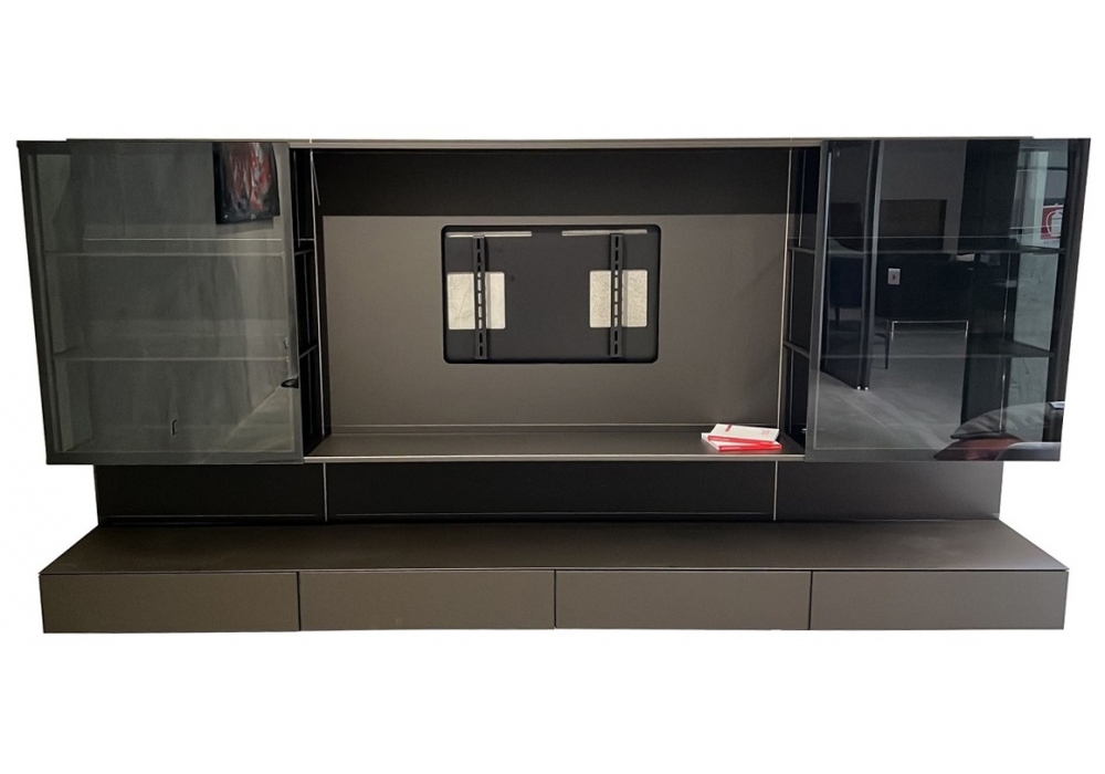 Abacus conçu par Giuseppe Bavuso pour Rimadesio est un système de salon avec meuble TV composé d'un conteneur suspendu avec tiroirs et vitrines avec portes coulissantes et étagères internes en verre.