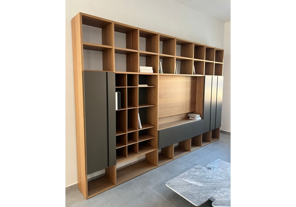 Selecta conçu par Lema est un mur équipé composé d'une structure, de fonds et d'une façade en noyer avec finition Terra et poignées push-pull noires.