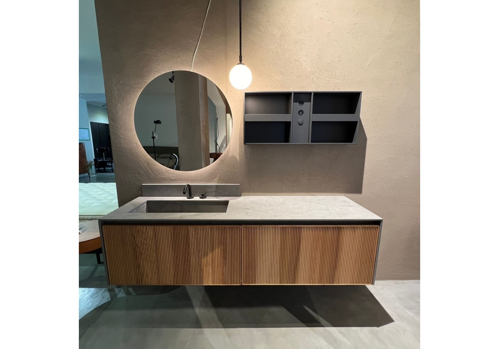 Free Zone conçu par CRS Boffi est un système de salle de bains modulaire avec des conteneurs suspendus en bois et des portes coplanaires. Plateau et structure en pierre composite. Suspension Bocce avec diffuseur en verre opalin et miroir Lotus lumineux.