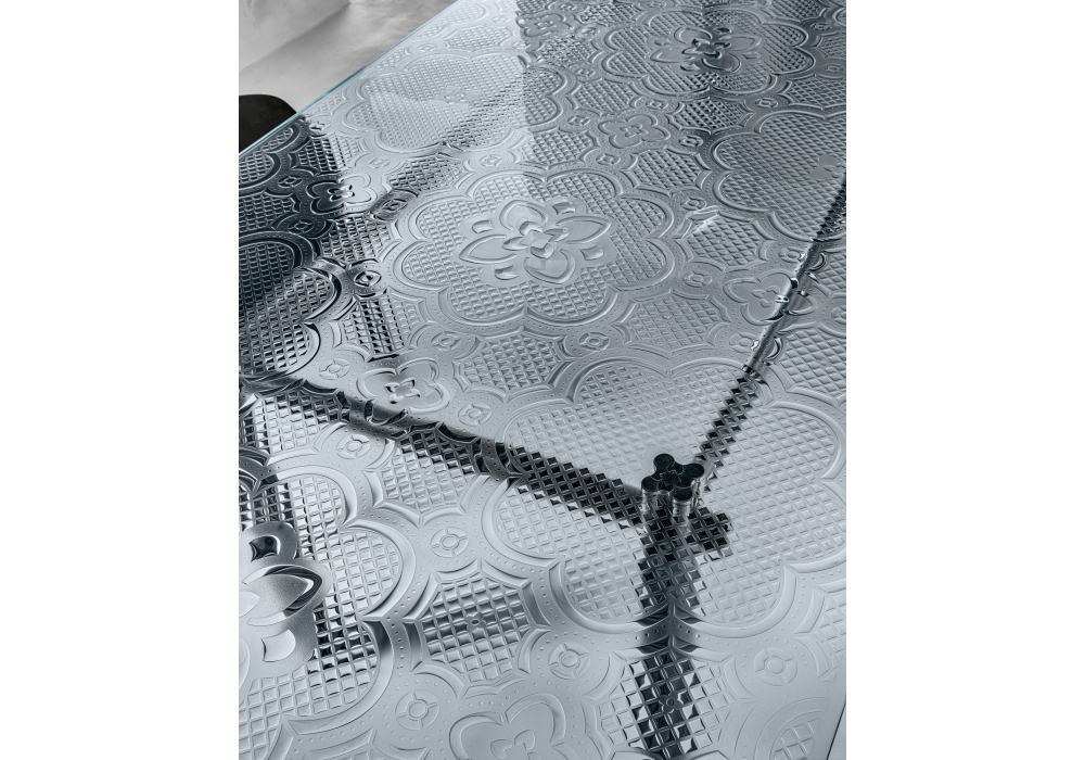 Cristaline conçue par Marcel Wanders Studio pour Fiam est une table avec base en métal en nickel noir brillant et plateau en verre fusionné extralight.