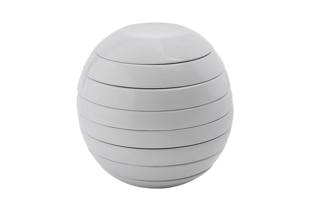 Giulietta E Romeo conçu par Riccardo Schweizer pour Bosa est un ensemble de plats pour deux personnes en céramique qui ressemble à une sphère qui se décompose magiquement, avec lignes parfaites et jeux interverrouillés qui permettent d'économiser de l'espace.