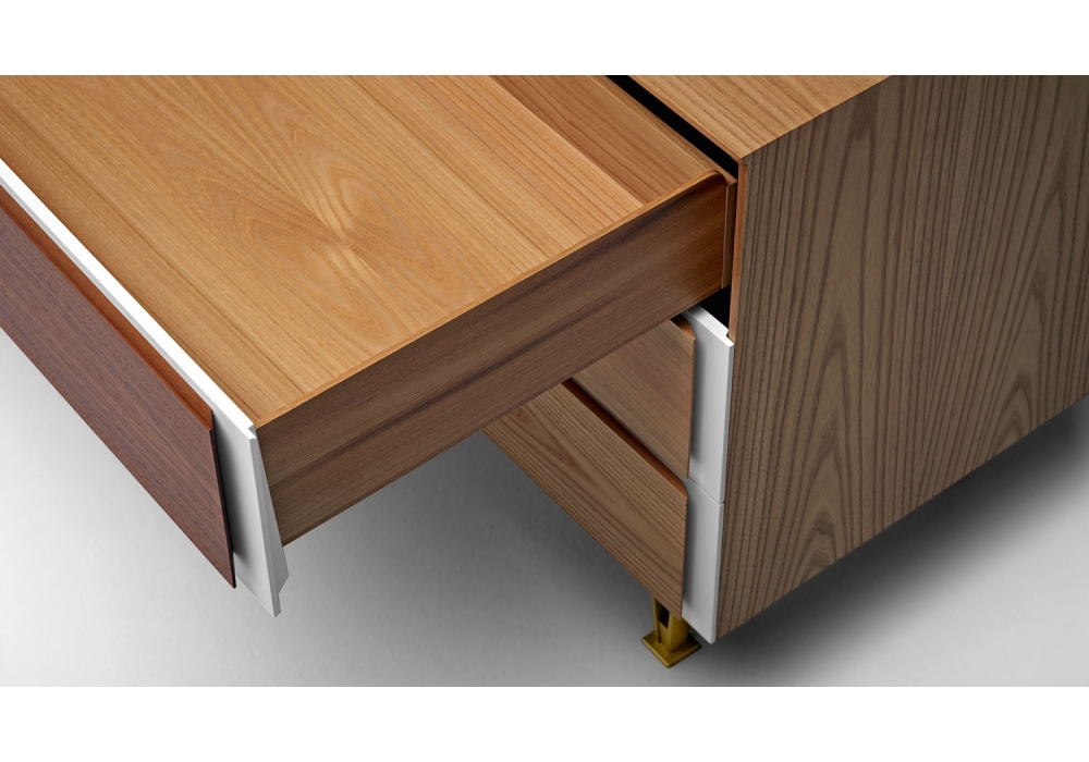 D.655.1 conçue par Gio Ponti pour Molteni&C est une commode caractérisée par des façades de tiroirs blanches peintes à la main avec des poignées appliquées de différentes essences (orme, noyer national, acajou et palissandre). La structure en bois d'orme est soutenue par des pieds en laiton satiné.
