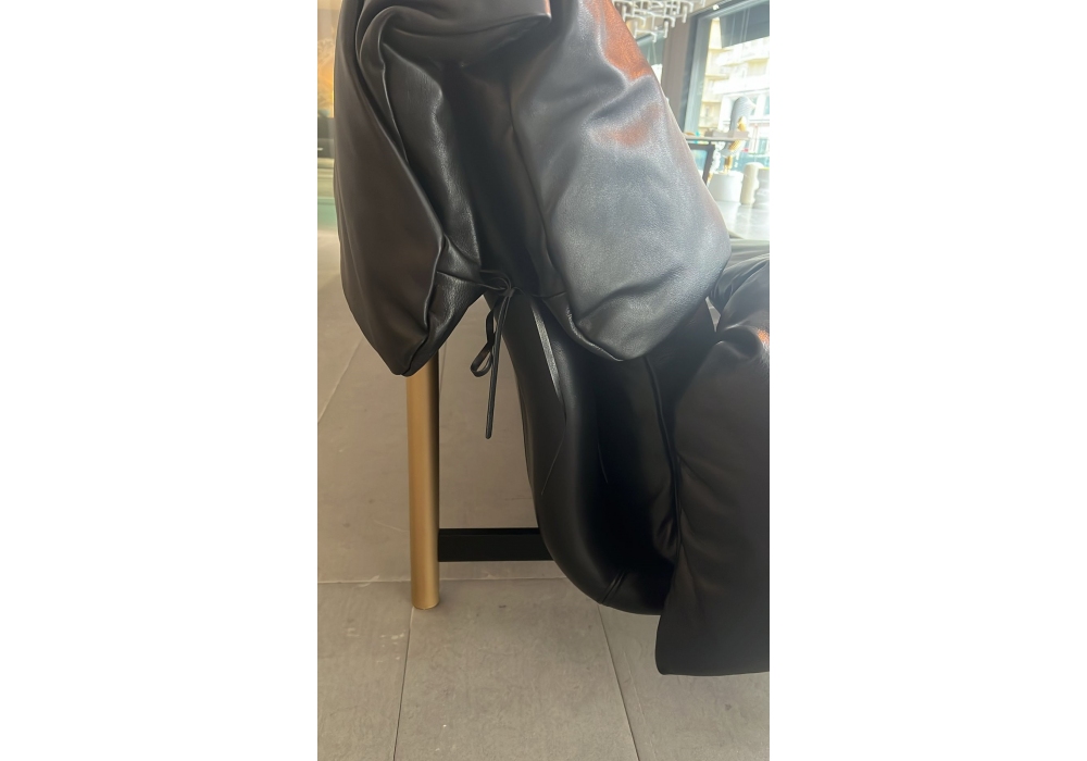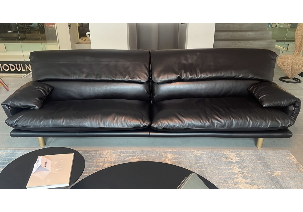 Jo conçu par Draga&Aurel pour Baxter est un canapé avec structure en métal verni noir mat et rembourrage en mousse de polyuréthane à densité différenciée. Coussins d'assise et d'accoudoirs en duvet d'oie lavé et stérilisé avec rembourrage en mousse de polyuréthane à densité différenciée. Pieds en laiton satiné. Revêtement en cuirs souples uniquement.