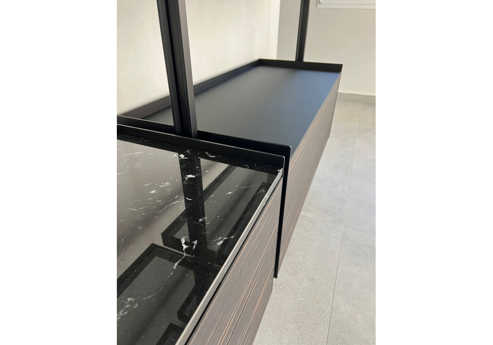 Zenit conçue par Giuseppe Bavuso pour Rimadesio est une bibliothèque murale réalisée avec une structure noire, des conteneurs avec tiroirs Tinto Ebano Taiga, un plateau en marbre Marquiña noir brillant et quatre sets de table en simili cuir, finition 159 Etna.