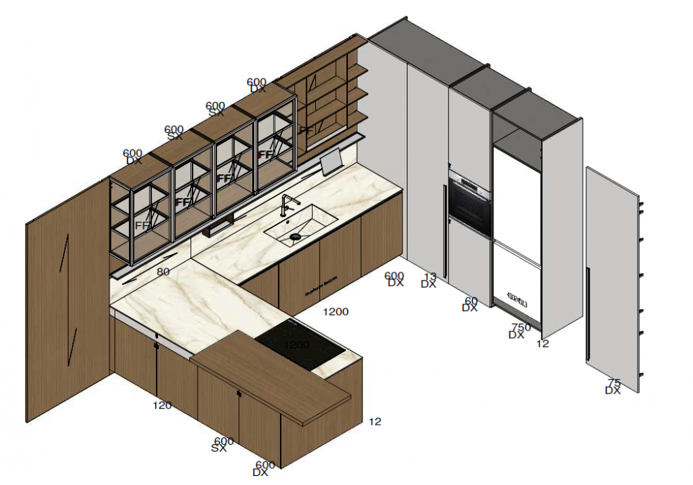 Sign conçue par Ernestomeda est une cuisine moderne réalisée avec des bases Canyon Canneté, un plan de travail Abitum, des meubles hauts en verre réfléchissant transparent et des colonnes HiMelamin gris soie avec poignée Trace.