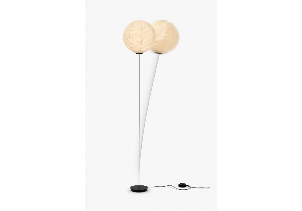 Cho Light conçu par Dimitri Bähler pour Established & Sons est un lampadaire, l'abat-jour est en papier japonais Washi monté magnétiquement sur une tige flexible en fibre de carbone. Câble PVC noir et interrupteur au pied réglable en continu.