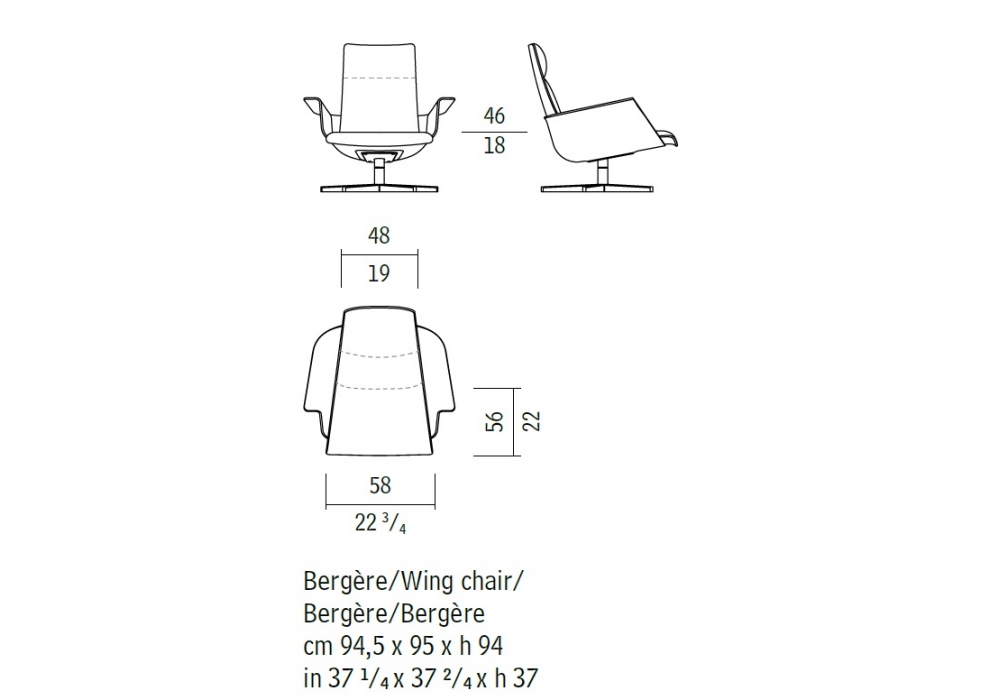 Clori conçu par Carlo Colombo pour Giorgetti est un fauteuil pivotant avec structure en cuir, base en métal et inserts en noyer Canaletto foncé. Revêtement en tissu déhoussable.