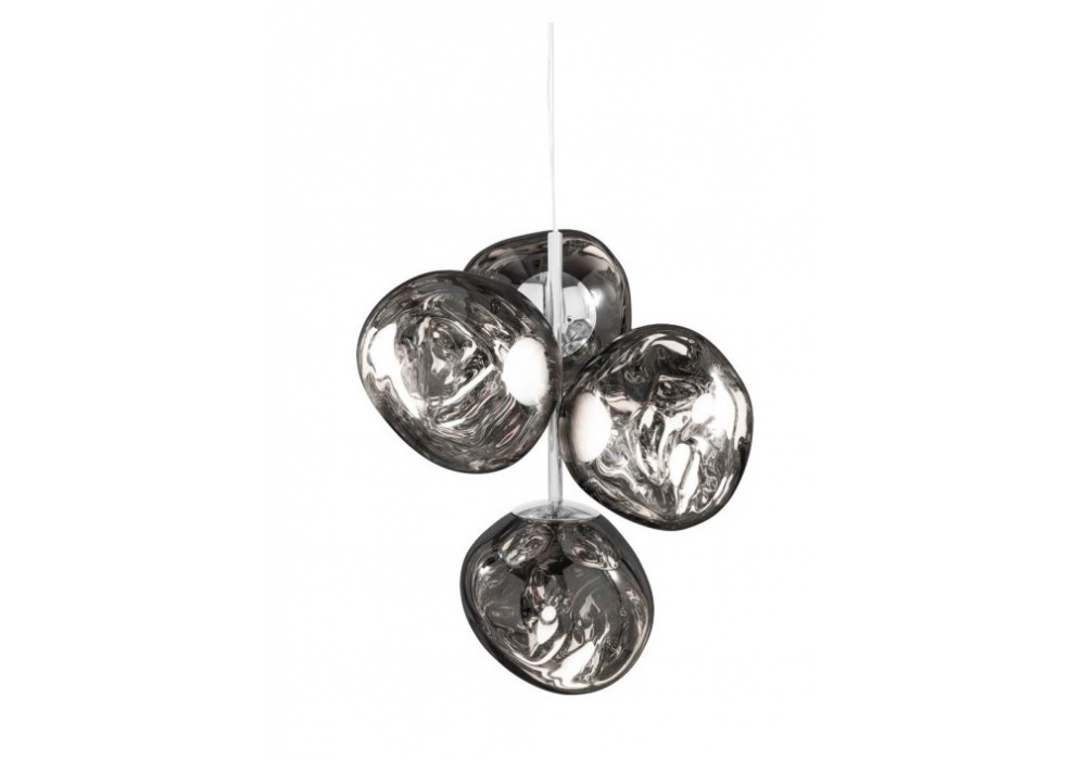 Melt Mini conçu par Tom Dixon est un lustre avec quatre diffuseurs à finition argentée.