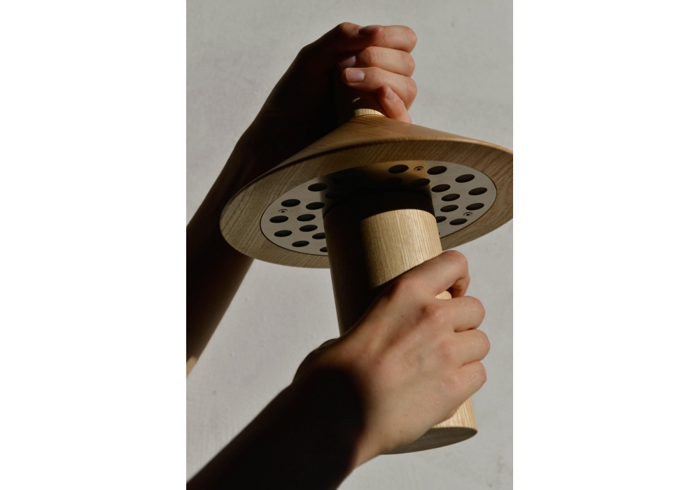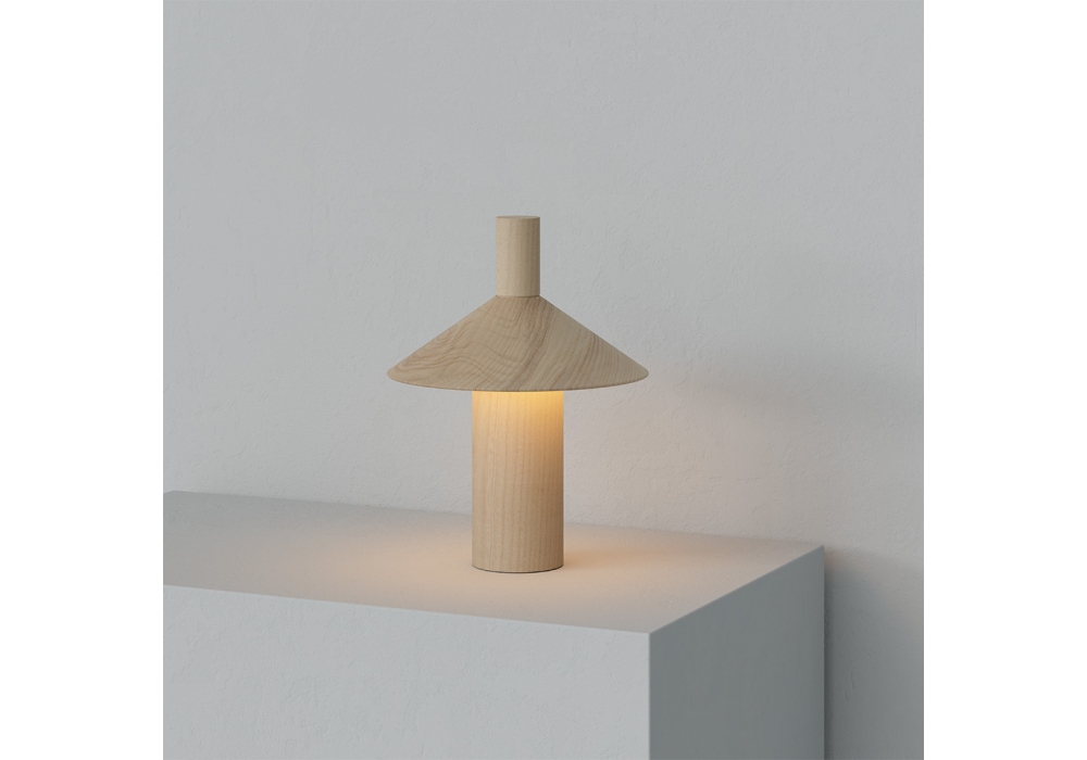 Pepa conçue par Francesco Faccin pour Astep est une lampe de table en bois de frêne naturel et acier inoxydable. Connecteur USB de type C.