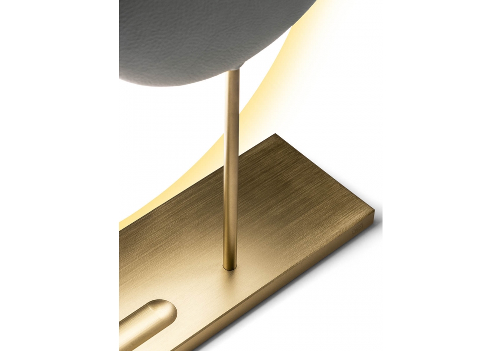 Moonbeam conçue par Six N. Five pour Poltrona Frau est une lampe de table réalisée avec une base en aluminium galvanisé laiton, un disque frontal en aluminium brut recouvert de cuir Pelle Frau et un corps d'éclairage en verre soufflé blanc lait opaque gravé à l'acide.