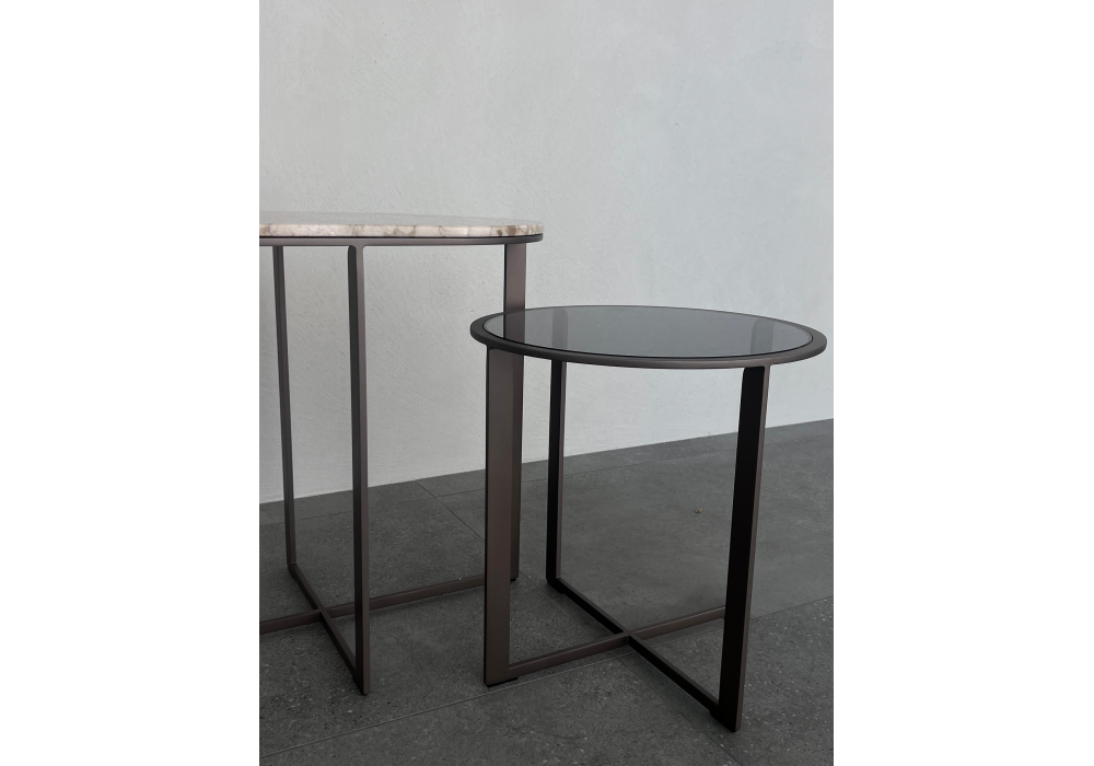 Rialto conçue par Giuseppe Bavuso pour Rimadesio est une table basse dotée d'une structure en métal. Disponible avec un plateau en marbre ou en verre.