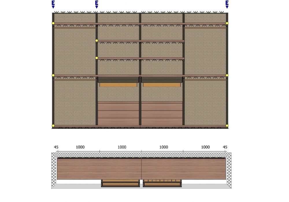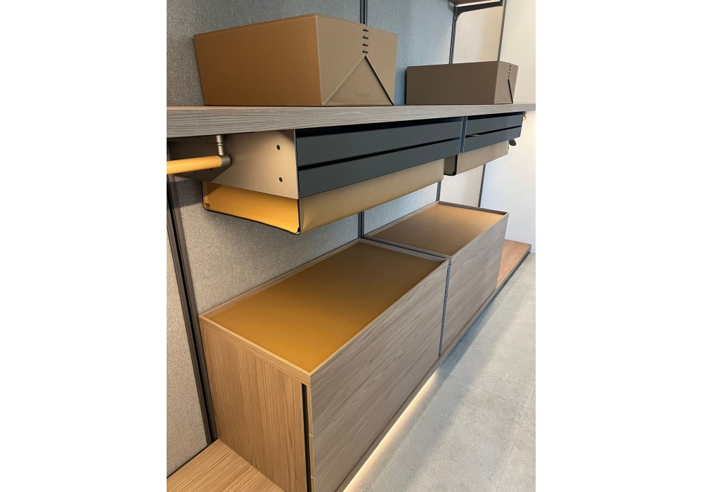 Dress Bold conçue par Giuseppe Bavuso pour Rimadesio est une cabine armoire au design essentiel et sophistiqué. Sa structure en Ecolorsystem® Bronzo s'harmonise avec le panneau en tissu Dolomiti. Les éléments en orme, de la base à l'étagère en passant par la commode, apportent une touche naturelle et élégante, tandis que le revêtement en similicuir Miele apporte confort et raffinement.