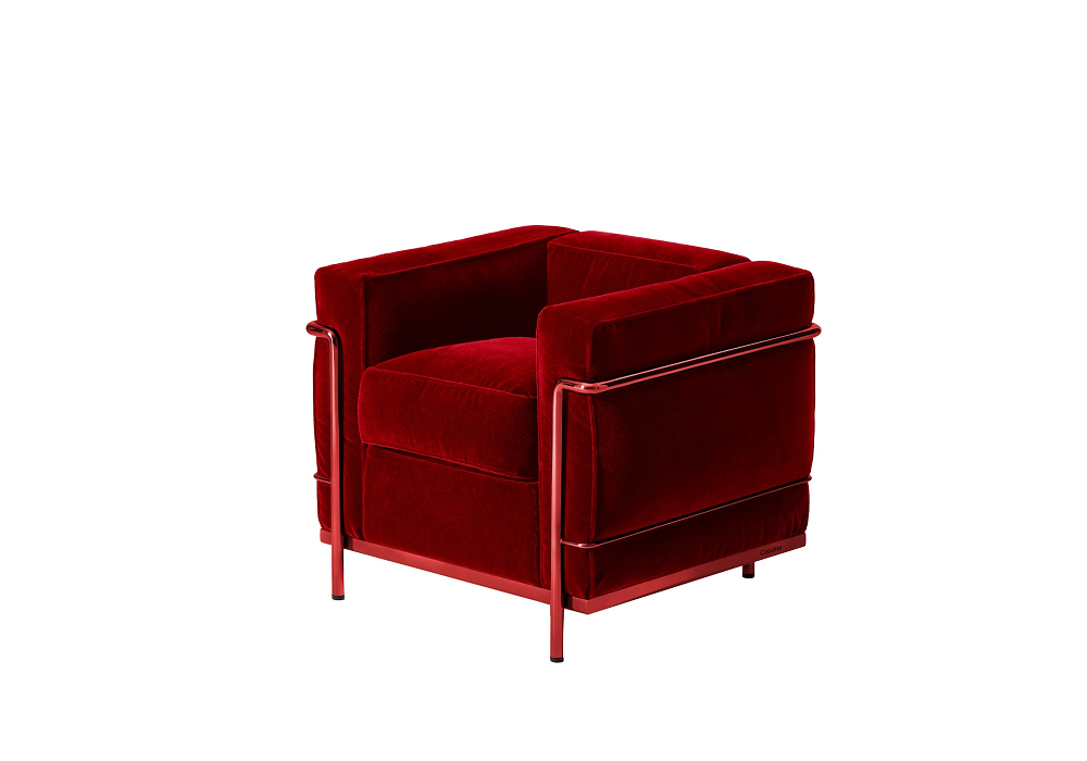 2 Fauteuil Grand Confort, Petit Modèle, Durable, 60 conçu par Le Corbusier, Pierre Jeanneret, Charlotte Perriand pour Cassina est un fauteuil recouvert de velours Lirico et doté d'une structure en métal brillant.
