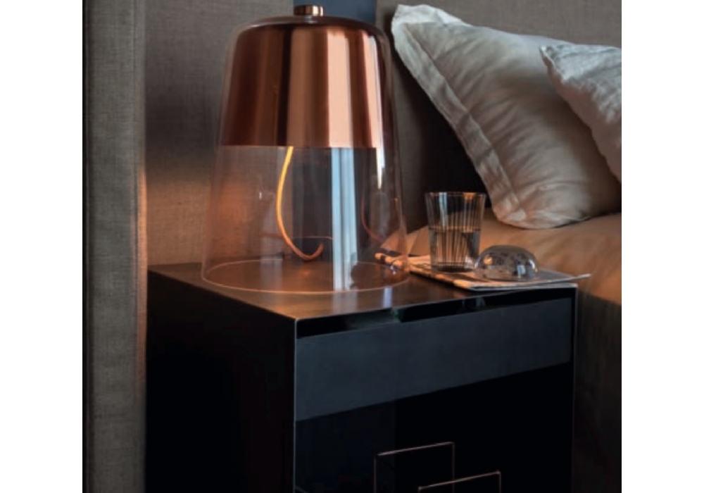 Semplice 226 conçue par Sam Hecht pour Oluce est une lampe de table composée d'une cloche en verre soufflé transparent et d'un variateur d'intensité rotatif situé sur le dessus. Finition intérieure en cuivre satiné.
